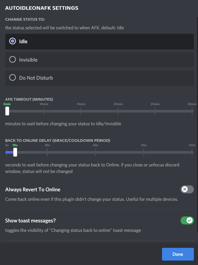 AutoIdleOnAFK.plugin.jsinto your BetterDiscord's plugin folder - Or download from BetterDiscord