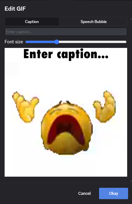 This plugin adds a way to add a custom caption to gifs in your gif picker directly within discord. Gifs inside the gif picker will have a new button at the top left that will open a dialog to create a custom caption.