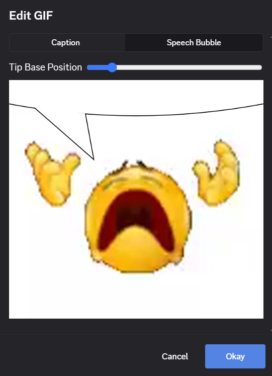 After completing this the gif will be rendered with the caption and sent to the channel you are currently in. You also have the option to add a speechbubble to the gif instead. Clicking on the gif will move where the tip of the speechbubble is.
