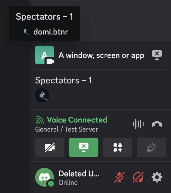 ShowSpectators Shows you who's spectating your stream under the screenshare panel This is a port of fres621 Who's watching plugin Preview 📥 Installation Download the file from here Save or move the file into your plugins folder Enable the plugin in the settings